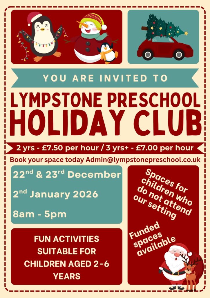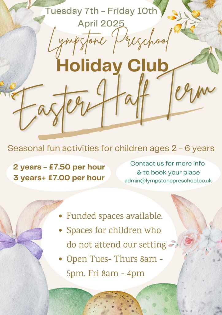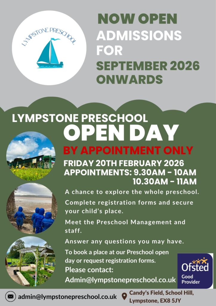 Lympstone Preschool is open 50 weeks of the year, Monday-Thursday 8am-6pm, Friday 8am-5pm.
